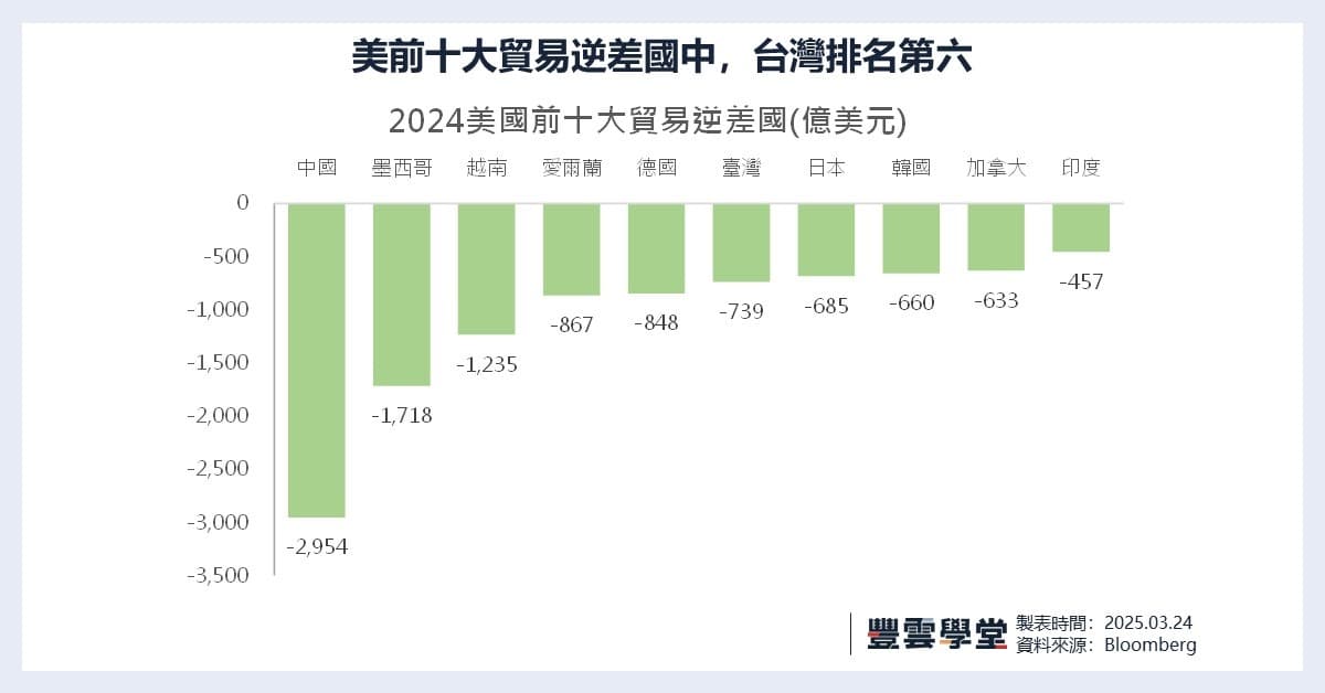 美國 2024 年進口總額約 3.3 兆美元(美國商務部估計),其中從台灣進口 1,135 億美元,出口至台灣 396 億美元,順差達 739 億美元。相較之下,美國對中國貿易赤字為 2,790 億美元(進口 4,270 億美元,出口 1,480 億美元),對墨西哥赤字 1,520 億美元。台灣順差雖不如中、墨顯著,但半導體與電子產品的關鍵性使其成為關稅目標。這些數據顯示,美國貿易逆差問題根深蒂固,台灣企業需評估自身定位。